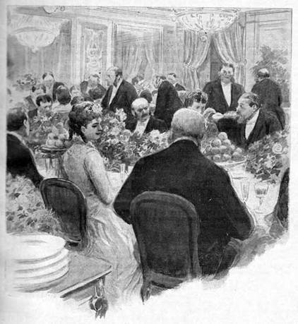 Alors tout le monde se leva et on passa dans le grand salon. Pendant que les invités du bal arrivaient en foule se mêler aux invités du dîner, que l’orchestre s’accordait, que les valseurs à lorgnon faisaient la roue devant les toilettes blanches des petites demoiselles impatientes, le marié, intimidé par tout ce monde, s’était réfugié avec son ami Planus – Sigismond Planus, caissier de la maison Fromont depuis trente ans – dans cette petite galerie ornée de fleurs, tapissée d’un papier de bosquet à feuillage grimpant qui fait comme un fond de verdure aux salons dorés de Véfour. Là du moins ils étaient seuls, ils pouvaient causer.