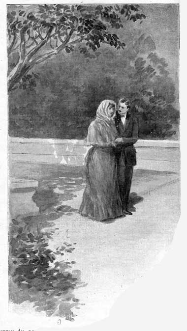 Un homme mince, élancé, qui avait la tournure de Georges, donnait le bras à une femme encapuchonnée de dentelles. Ils s’arrêtèrent d’abord sur le banc du paulownia dont les branches étaient en pleine fleur.