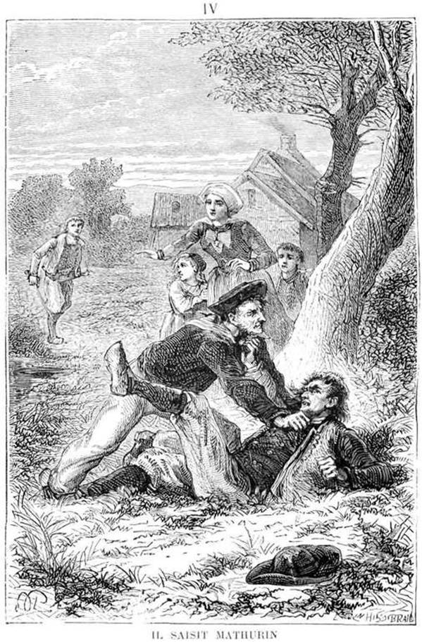 Emporté par la colère, Mathurin allongea un soufflet à la petite mendiante qu’il renversa du coup. À cette vue, Jobic se dégagea des mains de Marianne et tomba à coups de poing sur le fermier.