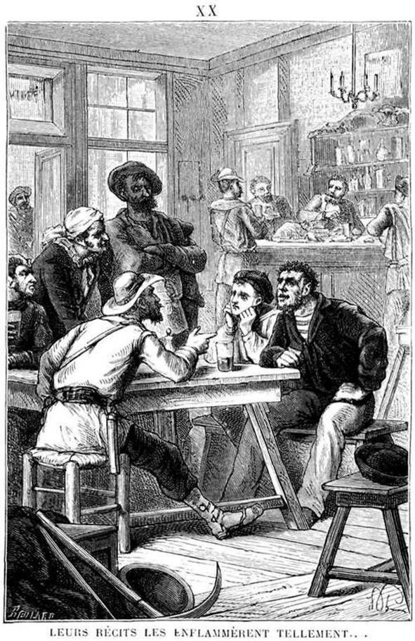 Ils tinrent leur parole, en effet, sauf Bernard et un autre marin, d’esprit assez borné, qui s’appelait Jérôme Sornin. Ces deux derniers eurent le malheur de se trouver dans un cabaret avec une bande de mineurs qui arrivaient des placers (endroits où l’on recueille l’or) et qui avaient fait une brillante campagne.
