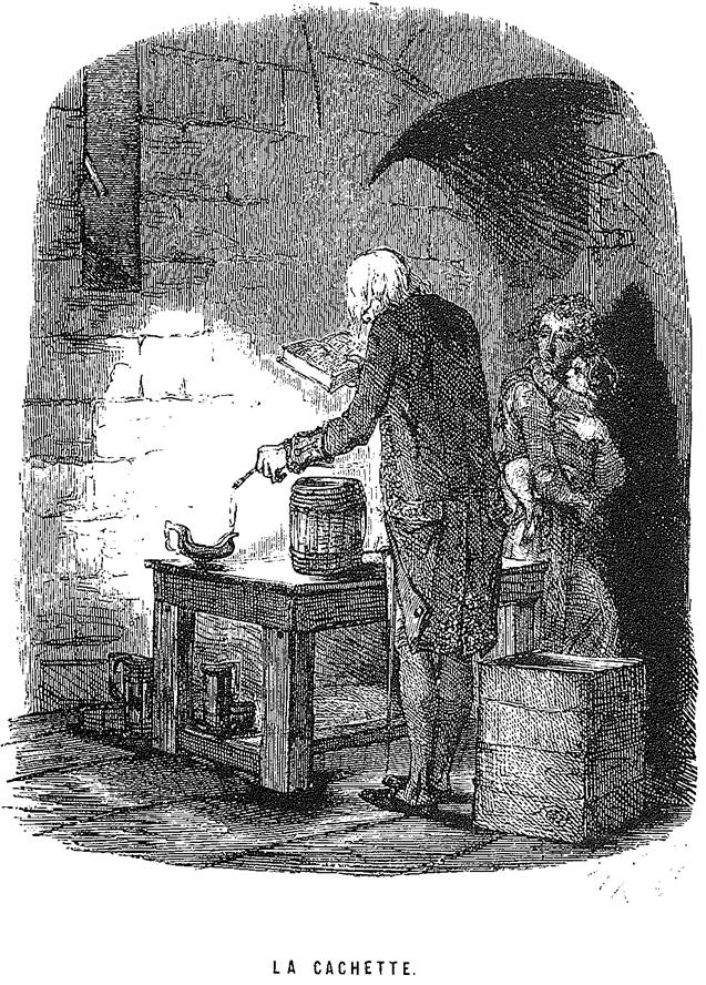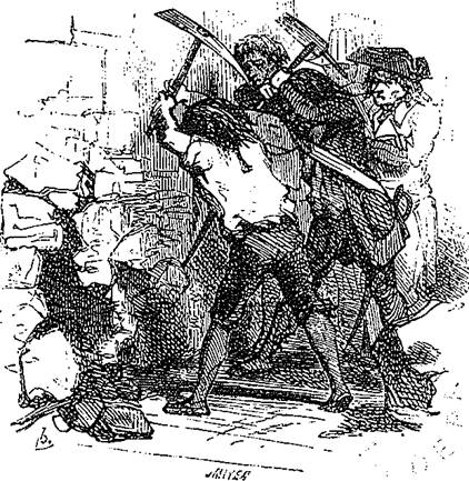 La seconde porte résista plus longtemps que la première, mais elle céda enfin ; un bruit confus de voix et de pas se fit entendre, et un violent coup de pince ébranla le chêne épais de la porte intérieure de la cachette.