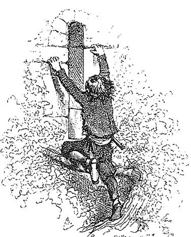Janet Legoff, cependant, faisait tous ses efforts pour voir ce qui se passait à l’intérieur de la cellule, où ne régnait plus qu’un sombre demi-jour. Nous voudrions bien dire au lecteur qu’il se trouvait là par l’effet d’un profond calcul, mais pourquoi altérer la vérité ? Janet était un enfant. Impatient de voir le travail de ses compagnons traîner en longueur, il avait voulu, le premier de tous, porter à sa jeune maîtresse un signal de salut. Or, il était alerte et audacieux ; de branche en branche, il parvint jusqu’à la meurtrière, à l’ouverture de laquelle il se cramponna.