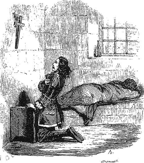 Le lendemain, dans une chambre basse de la Tour-le-Bât, les deux Saint-Maugon étaient réunis. Roger dormait d’un sommeil fiévreux et plein d’angoisses ; il était couché tout habillé sur le lit de camp, qui formait, avec deux escabelles, le mobilier de cette espèce de prison.
