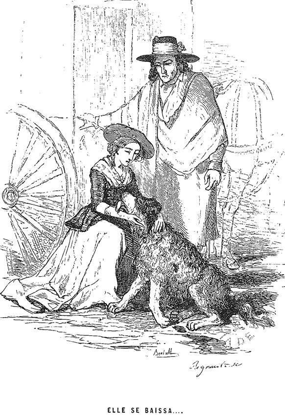 La voiture de voyage fut attelée à la barbe des républicains. M. de Bazouge y monta le premier. Quand ce fut au tour d’Henriette, elle se sentit retenue par sa robe, et vit à ses pieds César, dont l’œil plaintif et mourant semblait implorer une caresse. César l’avait suivie jusque-là. Depuis le perron, une large traînée de sang marquait la trace de son passage.