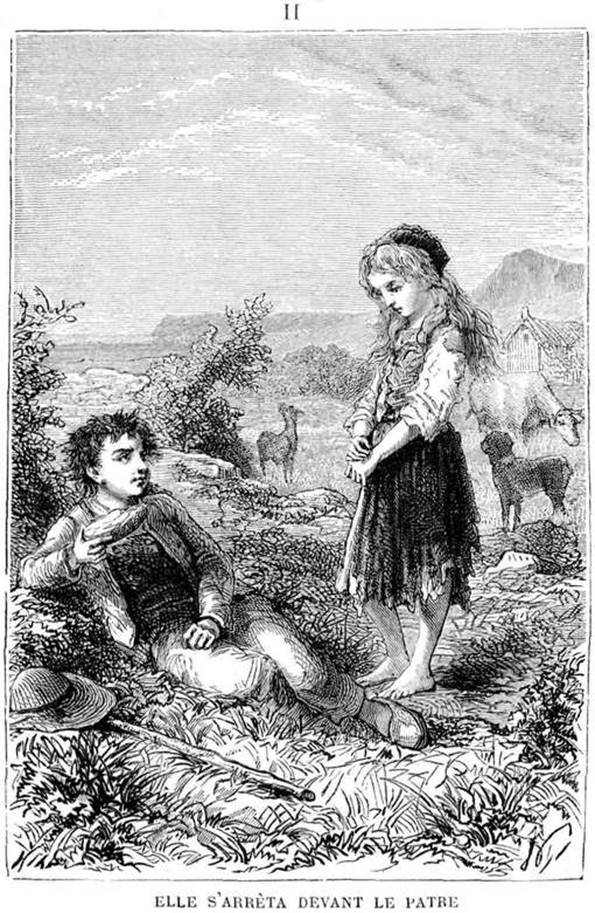 Nonchalamment assis, Charlot, sa tartine à la main, mangeait lentement, se dandinait, presque sommeillant et tout pénétré du plaisir de vivre. Comme il était dans cette heureuse disposition d’esprit, une petite fille de six à sept ans vint à passer. Elle était vêtue d’une robe trouée, ses pieds étaient nus, ses cheveux s’échappaient ébouriffés d’un petit bonnet noir. Elle s’arrêta devant le pâtre, la tête basse, et ses yeux, deux grands yeux noirs attristés, regardaient en dessous la tartine de lait caillé.