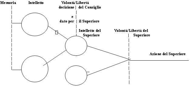 Le forze del superiore, proprio perché persona singola e limitata, sono impari ad assolvere da sole tutto il processo di governo. Il punto più delicato è quello della decision taking, il punto 3, quello della decisione, dell’elezione, al quale sono ordinati i primi due e che si presuppone al punto 4. È giusto che sia riservato al superiore. Per gli altri momenti, sia quello della formazione della decisione (decision making; punti 1 e 2), sia quello dell’esecuzione della decisione (punto 4) ha bisogno di farsi aiutare: il compito della memoria (o meglio di aiutarlo nella memoria) è affidato soprattutto al Segretario; il compito dell’intelletto (o meglio ad aiutarlo nell’intelletto e a discernere) è affidato soprattutto ai Consiglieri, al consiglio ecc…; il compito di aiutarlo nell’esecuzione è affidato al procuratore. Se è vero che è a lui, al Superiore, che fondamentalmente compete prendere la decisione ed esplicare, pertanto, la funzione che nella persona umana spetta alla volontà/libertà, non è meno vero che la volontà umana ordinata rettamente non si muove se non mossa o almeno illuminata , anche se non determinata, dall’intelletto. Il Superiore che volesse governare senza l’aiuto del consiglio cadrebbe nel volontarismo che tradotto in termini di governo dovremmo chiamare autoritarismo; se, invece, all’opposto si facesse sempre determinare dai consiglieri e dal consiglio, scadendo in un tipo di governo abitualmente collegiale, rinuncerebbe alla sua libertà e cadrebbe in un governo razionalistico che impedirebbe la dimensione personale del suo governo ridisegnandolo non secondo lo Spirito, ma secondo le forze dal basso che più facilmente schiacciano il suddito. Infatti, essendo impensabile che il sudditopossa aprirsi in profondità con tutti i membri del Consiglio, la decisione di governo che lo riguarderebbe potrebbe non tenere conto sufficientemente dei dati personali attraverso anche i quali Dio fa conoscere la sua volontà.